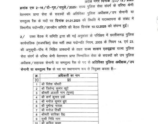 गृह (पुलिस) विभाग द्वारा विभागीय पदोन्नति एवं छानबीन समिति की अनुशंसा के आधार पर राज्य पुलिस सेवा संवर्ग के वरिष्ठ श्रेणी वेतनमान प्राप्त 16 अधिकारियों को उप पुलिस अधीक्षक/सहायक सेनानी या समतुल्य रैंक के पद से अतिरिक्त पुलिस अधीक्षक/उप सेनानी या समतुल्य रैंक के पद पर स्थानापन्न रूप से पदोन्नत किया गया है. पदोन्नत अधिकारियों में रितेश चौधरी, जितेन्द्र कुमार खूंटे, मती अंजली नाग (गुप्ता), कर्ण कुमार उके, मनोज कुमार ध्रुव, पुष्पेन्द्र नायक, मनोज तिर्की, मती सारिका वैद्य, सु निधि नाग, कपिल चन्द्रा, अविनाश कुमार मिश्रा, ईश्वर प्रसाद त्रिवेदी, योगेश कुमार साहू, मयंक तिवारी, सु रश्मीत कौर चांवला तथा अनिल कुमार विश्वकर्मा शामिल हैं.