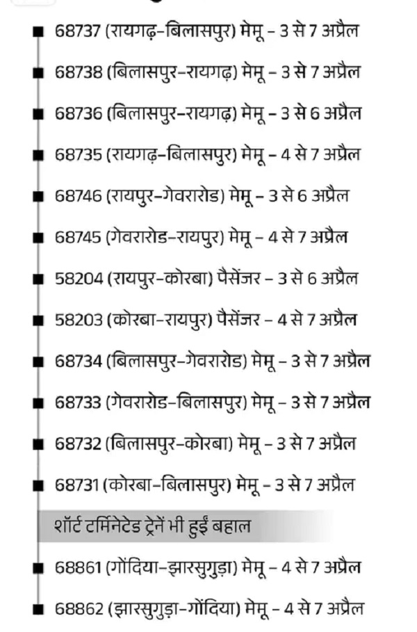 रेलवे प्रशासन ने यात्रियों की सुविधा को ध्यान में रखते हुए इन ट्रेनों का संचालन चरणबद्ध तरीके से शुरू करने का निर्णय लिया है। इससे रायपुर, गेवरा रोड, बिलासपुर, रायगढ़, झारसुगुड़ा और गोंदिया जैसे प्रमुख मार्गों पर यात्रा करने वाले यात्रियों को बड़ी राहत मिलेगी।