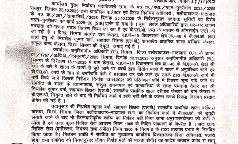 बलौदाबाजार में प्रधानपाठक और दो सहायक शिक्षक निलंबित, SIR ड्यूटी में अनुशासनहीनता पर की बड़ी कार्रवाई
