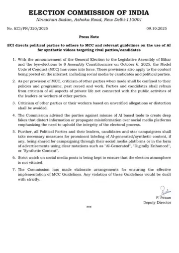 ECI ने कहा है कि अब सोशल मीडिया प्लेटफॉर्म्स पर भी उतनी ही सख्ती बरती जाएगी जितनी मैदान में प्रचार के दौरान होती है। हर ट्वीट, वीडियो, पोस्ट या विज्ञापन पर नजर रखी जा रही है ताकि कोई भी राजनीतिक दल या उम्मीदवार फेक वीडियो या एआई आधारित झूठी सामग्री के जरिए चुनावी माहौल को खराब न करे।