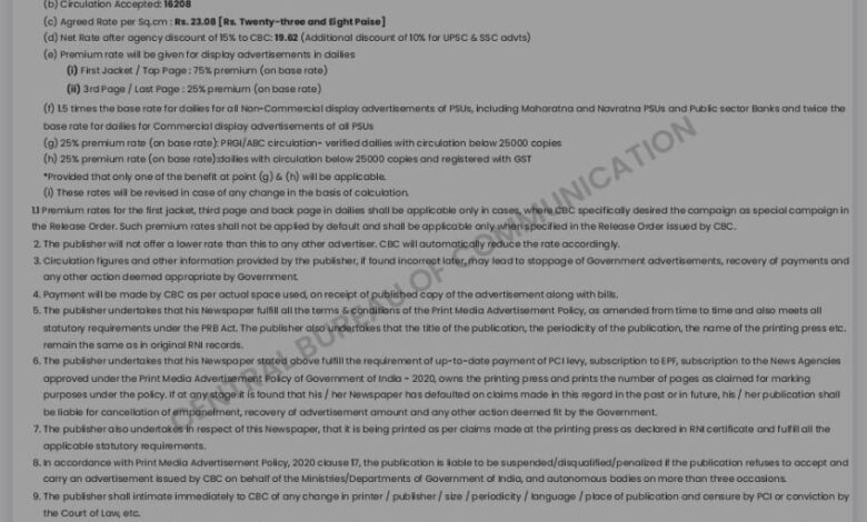सूचना एवं प्रसारण मंत्रालय के सेंट्रल ब्यूरो ऑफ कम्युनिकेशन ने जारी किया अनुबंध, रेट्स व शर्तें निर्धारित