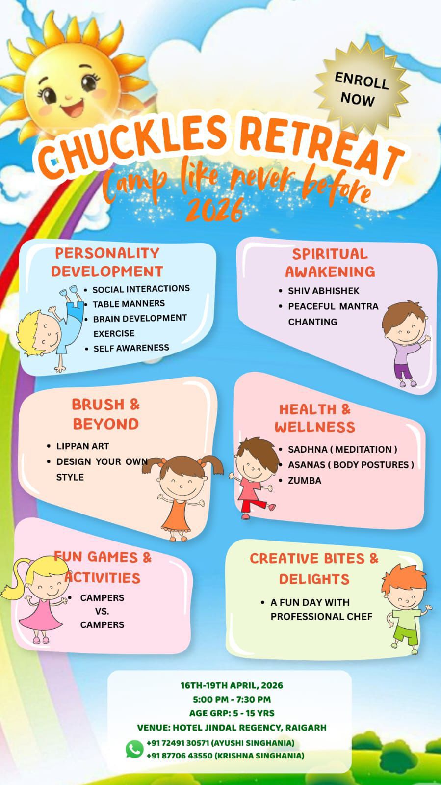 रायगढ़ टॉप न्यूज 13 अप्रैल। शहर में बच्चों के सर्वांगीण विकास को ध्यान में रखते हुए 16 से 19 अप्रैल 2026 तक “चक्ल्स रिट्रीट – कैंप लाइक नेवर बिफोर 2026” का आयोजन किया जा रहा है। यह कैंप होटल जिंदल रीजेंसी, रायगढ़ में प्रतिदिन शाम 5:00 बजे से 7:30 बजे तक संचालित होगा। इसमें 5 से 15 वर्ष आयु वर्ग के बच्चे भाग ले सकेंगे।