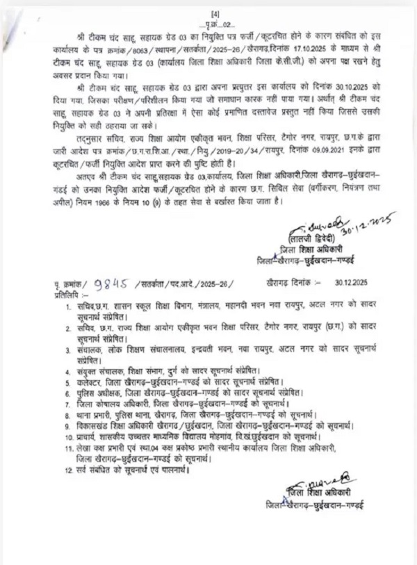 खैरागढ़-छुईखदान-गंडई जिला शिक्षा विभाग की ओर से फर्जी दस्तावेजों के आधार पर सरकारी नौकरी हासिल करने वालों पर बड़ी कार्रवाई की है। विभागीय स्तर पर की गई विस्तृत जांच के बाद चार कर्मचारियों को नौकरी से बर्खास्त कर दिया गया है। इस कार्रवाई को विभाग की अब तक की सबसे कड़ी अनुशासनात्मक पहल माना जा रहा है।