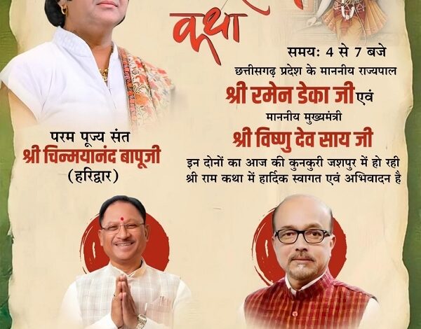 कुनकुरी में श्री राम कथा का भव्य आयोजन,आज राज्यपाल रमेन डेका एवं मुख्यमंत्री श्री विष्णुदेव साय होंगे शामिल
