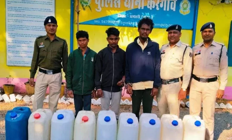 धमतरी: जिले में अवैध शराब कारोबार पर लगाम कसने के लिए एसपी के निर्देशानुसार थाना/चौकियों द्वारा चलाए जा रहे विशेष अभियान के तहत थाना केरेगांव पुलिस ने ग्राम सलोनी भाटापारा में एक महत्वपूर्ण कार्यवाही की। पुलिस ने यादव समाज भवन के पास स्थित एक मकान में दबिश दी, जहां तीन लोग अवैध रूप से देशी कच्ची महुआ शराब रखकर बेच रहे थे।