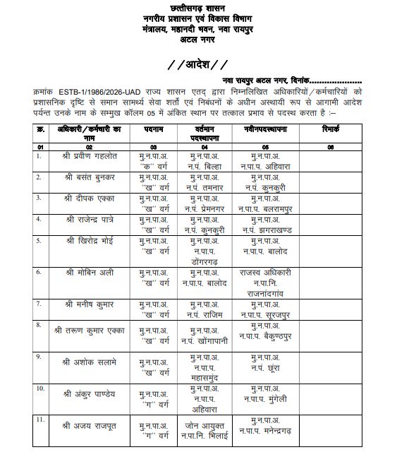 रायपुर। छत्तीसगढ़ शासन के नगरीय प्रशासन एवं विकास विभाग ने बड़ा प्रशासनिक फेरबदल करते हुए कुल 37 अधिकारियों और कर्मचारियों का तबादला किया है। इस संबंध में आदेश भी जारी किया गया है।