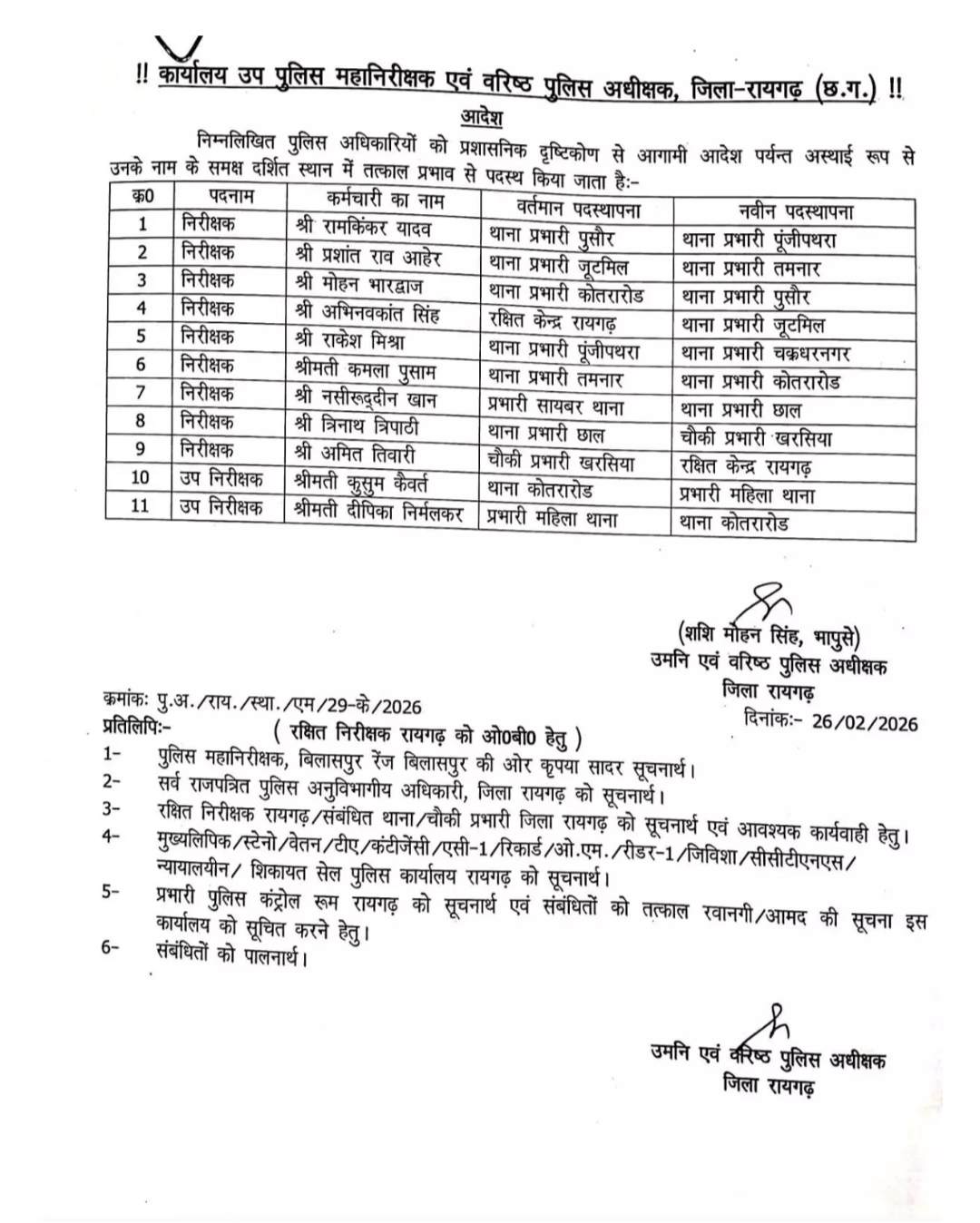 रायगढ़ पुलिस विभाग में भारी उलटफेर SSP शशि मोहन सिंह ने 11 अधिकारियों का किया तबादला, राकेश मिश्रा चक्रधर नगर तो अभिनवकांत जूट मिल थाना प्रभारी बने कमला पुसाम को थाना कोतरा रोड प्रभारी बनाया गया