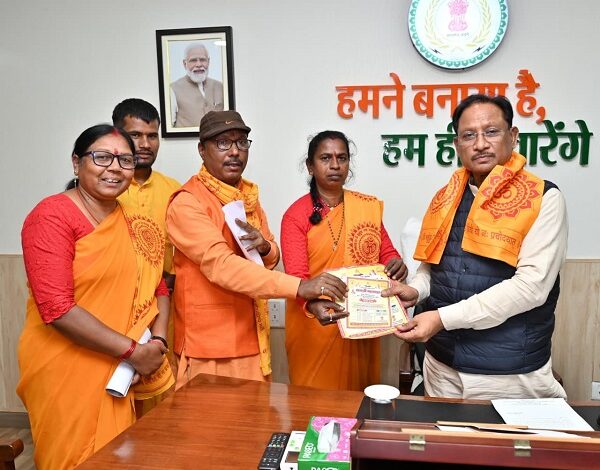 रायपुर, 5 दिसंबर 2025. मुख्यमंत्री विष्णु देव साय से विगत दिवस राजधानी रायपुर स्थित मुख्यमंत्री निवास कार्यालय में अखिल विश्व गायत्री परिवार के प्रतिनिधिमण्डल ने सौजन्य मुलाकात की। प्रतिनिधिमण्डल ने मुख्यमंत्री साय को आगामी 10 दिसंबर से 13 दिसंबर तक जशपुर जिले के अंतर्गत नगर पंचायत बगीचा में आयोजित होने वाले 108 कुण्डीय गायत्री महायज्ञ में शामिल होने हेतु आमंत्रित किया।मुख्यमंत्री विष्णुदेव साय ने आमंत्रण के लिए गायत्री परिवार के सदस्यों का धन्यवाद देते हुए आयोजन की सफलता के लिए शुभकामनाएँ दीं। इस अवसर पर भानु यादव, मुक्ता देवी, रीना बरला, मिकलेश यादव एवं अन्य सदस्य उपस्थित थे।