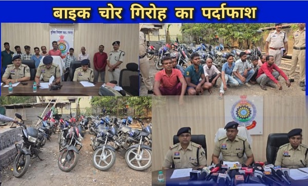 रायगढ़ 4 अप्रैल 2026। वरिष्ठ पुलिस अधीक्षक शशि मोहन सिंह के दिशा निर्देशन तथा एडिशनल एसपी श्री अनिल कुमार सोनी के मार्गदर्शन में साइबर थाना और पूंजीपथरा पुलिस की संयुक्त टीम ने एक अंतर्राज्यीय बाइक चोर गिरोह का पर्दाफाश करते हुए चोरी की 21 मोटरसाइकिल बरामद की है। मुख्य आरोपी सुखदेव चौहान को गिरफ्तार किया गया है, उसका साथी शिव नागवंशी फरार है। पुलिस ने चोरी की बाइक खरीदने वाले 9 आरोपियों को भी गिरफ्तार किया है। बरामद 21 मोटरसाइकिलों की बाजार कीमत करीब 15 लाख रुपये आंकी गई है।
