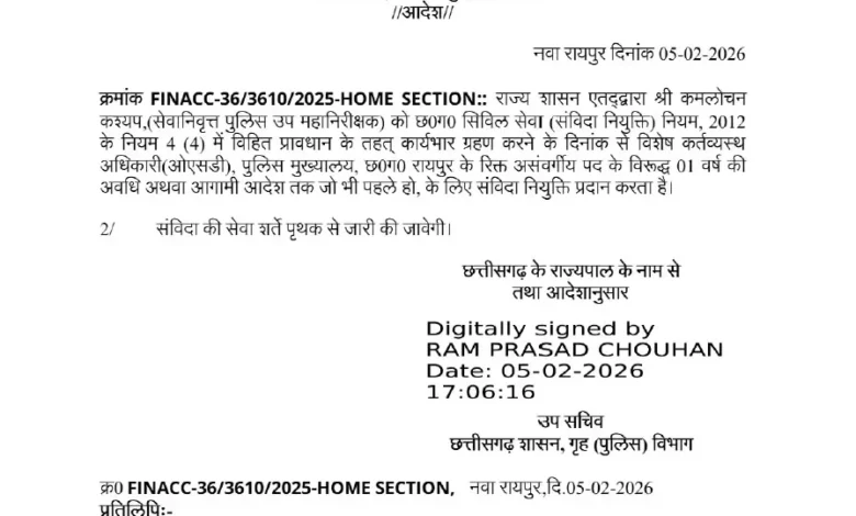 गृह विभाग द्वारा जारी आदेश के अनुसार, राज्य शासन ने छत्तीसगढ़ सिविल सेवा (संविदा नियुक्ति) नियम, 2012 के नियम 4(4) के अंतर्गत यह संविदा नियुक्ति प्रदान की है। कमलोचन कश्यप को कार्यभार ग्रहण करने की तिथि से एक वर्ष की अवधि अथवा अगले आदेश तक (जो पहले हो) के लिए PHQ रायपुर में रिक्त असंवर्गीय पद पर OSD के रूप में तैनात किया गया है।