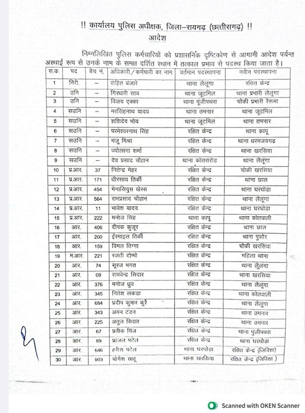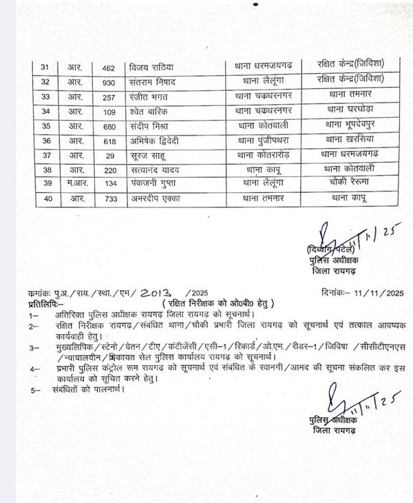 Raigarh News: रायगढ़ एसपी ने किया बड़ा प्रशासनिक फेरबदल, 40 पुलिसकर्मी किए गए इधर से उधर, आदेश जारी…देखिए लिस्ट…