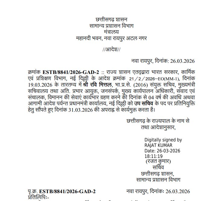 रायपुर। छत्तीसगढ़ सरकार ने प्रशासनिक फेरबदल करते हुए रजत बंसल को मुख्यमंत्री सचिवालय में पोस्टिंग के साथ जनसंपर्क आयुक्त का प्रभार सौंपा है, जबकि रवि मित्तल को प्रधानमंत्री कार्यालय (PMO) में उप सचिव पद के लिए रिलीव कर दिया गया है। सामान्य प्रशासन विभाग द्वारा जारी आदेश के अनुसार दोनों निर्णय तत्काल प्रभाव से लागू किए गए हैं।