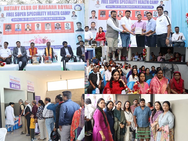 रायगढ़, रोटरी क्लब ऑफ़ रायगढ़ रॉयल एवं सुयश हॉस्पिटल रायपुर के तत्वाधान में विगत 30 नवम्बर, रविवार को अशर्फी देवी महिला चिकित्सालय, बूजी भवन के पास, रायगढ़ में आयोजित निःशुल्क सुपर स्पेशलिटी स्वास्थ्य शिविर अत्यंत सफल रहा। शिविर में मरीजों की सोनोग्राफी, सीटी स्कैन और एक्स-रे का पूरा खर्च रामदास–द्रौपदी फ़ाउंडेशन द्वारा वहन किया गया, जिसके लिए क्लब ने फ़ाउंडेशन का हृदय से आभार व्यक्त किया। शिविर सुबह 10 बजे से शाम 4 बजे तक चला और इसमें कुल 300 से अधिक लोगों का सफल परीक्षण किया गया।