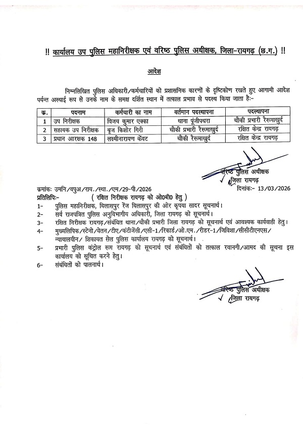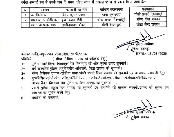 साथ ही थाना पूंजीपथरा में पदस्थ उपनिरीक्षक विजय एक्का को चौकी रैरूमाखुर्द प्रभारी बनाया गया है।